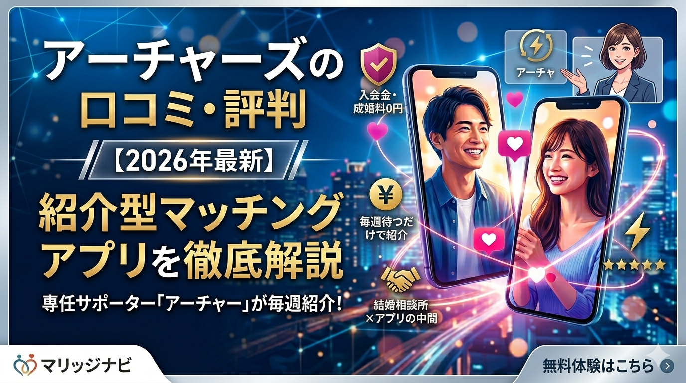 そんなジレンマを抱えている方に向けて、この記事では結婚相談所とマッチングアプリの中間に位置する「紹介型マッチングアプリ」として話題の『アーチャーズ(Archers)』の口コミ・評判や特徴を徹底解説します。