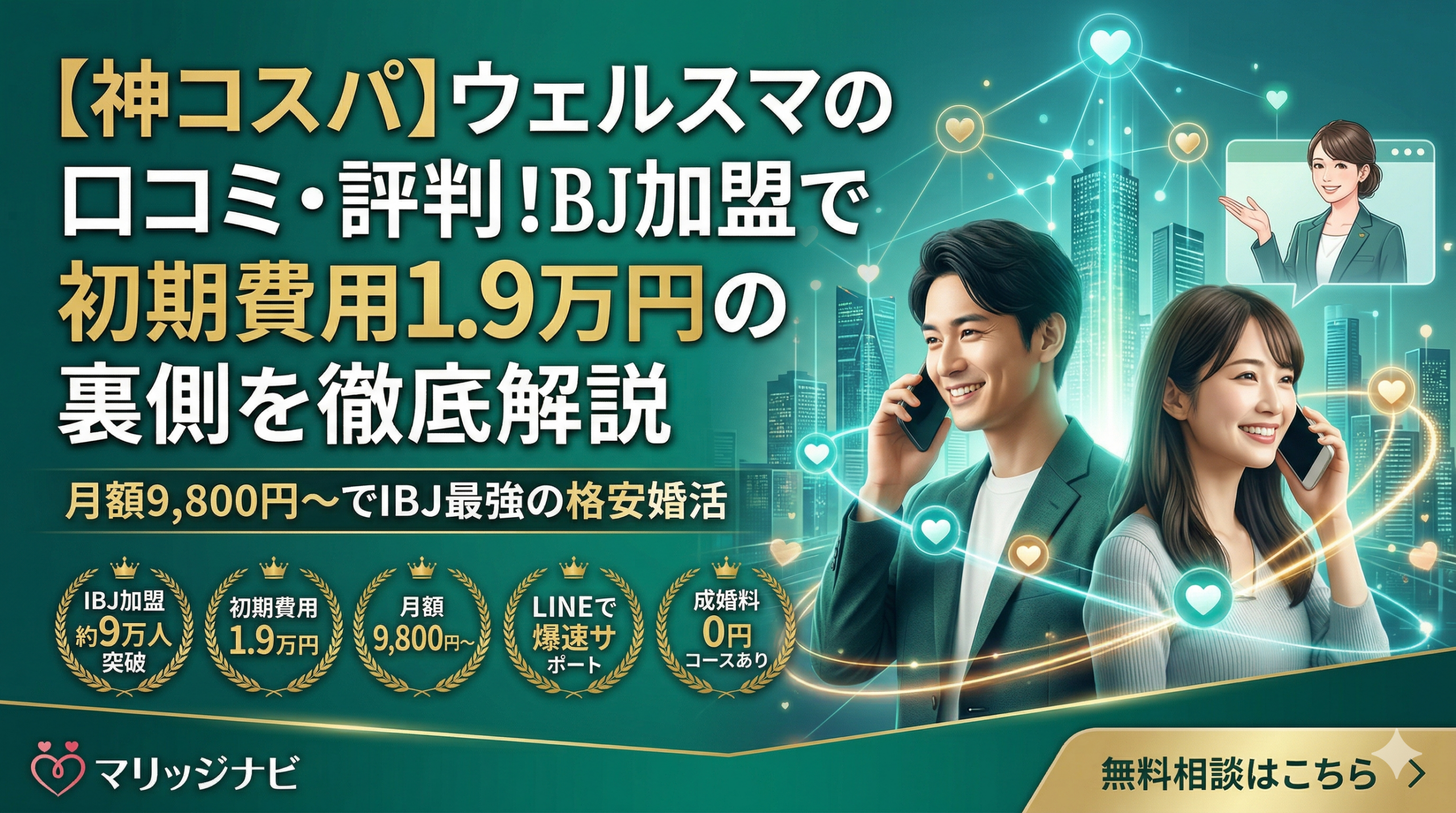 そんなお悩みを抱える方に向けて、この記事では、IBJ(日本結婚相談所連盟)加盟でありながら業界最安水準の料金を実現しているオンライン完結型結婚相談所「ウェルスマ」の口コミ・評判や特徴を徹底解説します 。