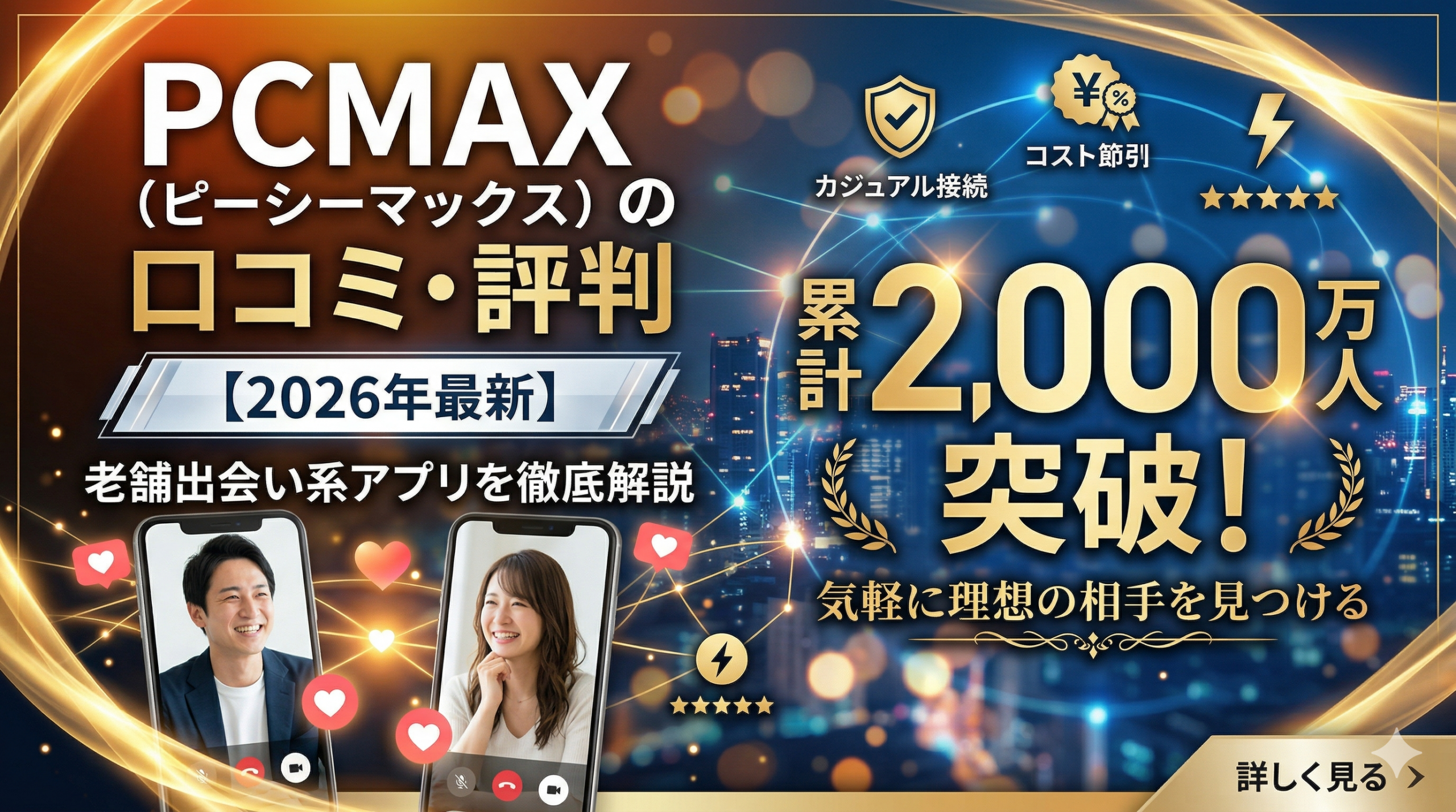 そんな疑問をお持ちの方に向けて、この記事では老舗出会い系アプリ「PCMAX(ピーシーマックス)」の口コミ・評判を2026年最新情報をもとに徹底解説します。